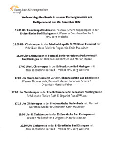 Als Kirchengemeinde haben wir ein vielfältiges Programm zu bieten. Ob Gottesdienste oder Konfi-Kurse, ökumenische Kinderkirche oder Gäste- und Tourismusseelsorge, Gospelchöre oder Ausstellungen, Zusammenarbeit mit der Lebenshilfe Bad Kissingen oder Einsatz für Demokratie und Vielfalt, wir möchten mit allem, was wir sind und tun, einen weiten und menschenfreundlichen Horizont atmen.