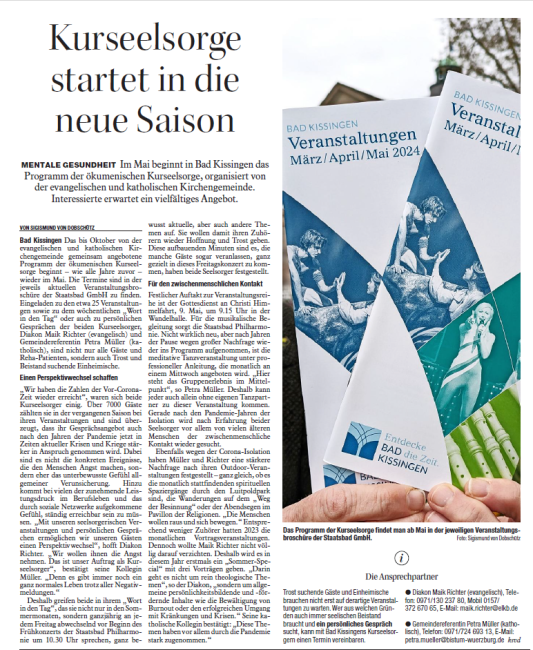 Hinter den vielfältigen Angeboten steht ein engagiertes Team, das Menschen auf ihrem Weg begleitet: Petra Müller, katholische Gemeindereferentin, ist als Kur- und Rehaseelsorgerin ausschließlich in Bad Kissingen tätig, während Gemeindereferentin Susanne Köhler mit ihrer halben Stelle in Bad Bocklet wirkt. Von der evangelischen Seite bringt sich Maik Richter, Diakon, für die Gäste- und Tourismusseelsorge in beiden Orten ein.