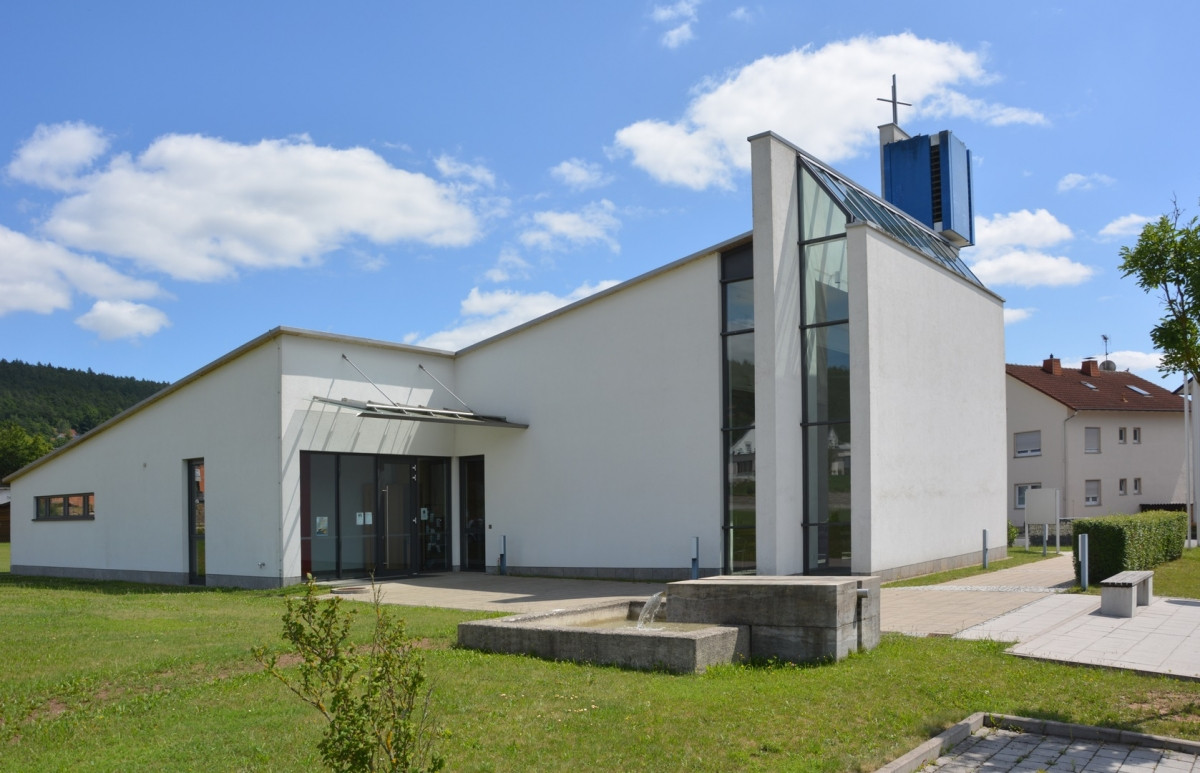 2002 ist sie in Bad Bocklet erbaut worden (mehr...) und gehört zu den wenigen zeitgenössischen Kirchen in der Evangelisch-Lutherischen Kirche in Bayern. Der Würzburger Architekt Gerhard Grellmann hat sie geplant und ihr mit ihrer schlichten und auf das Wesentliche bedachten Architektur eine besondere Wirkkraft gegeben. Die konzentrierte Ausstattung, die die Taufe in den Mittelpunkt stellt, trägt dazu bei, dass ein besonderes Gesamtkunstwerk und auch eine einzigartige Taufkirche entstanden ist.