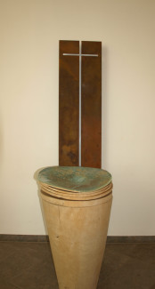 Unmittelbar hinter die Taufstele hat Mally ein aus einer Rostplatte gestanztes Kreuz gestellt. Dadurch entstehen zwei Platten, die an die zwei Tafeln der 10 Gebote erinnern, die Mose als Leitlinien für ein gutes Miteinander von Gott am Sinai erhalten hat. Das an dieser Stelle herausgenommene Kreuz findet sich als Positiv neben dem Lesepult.